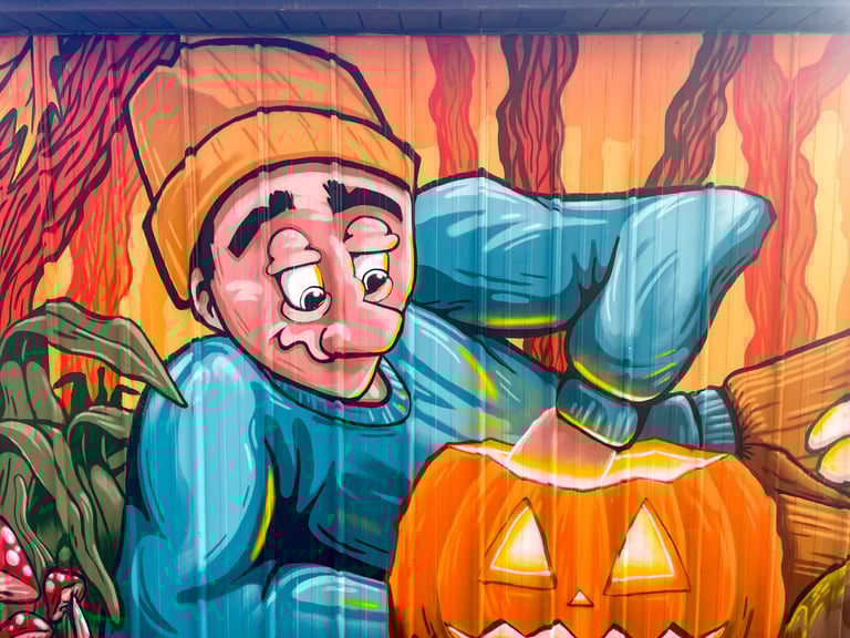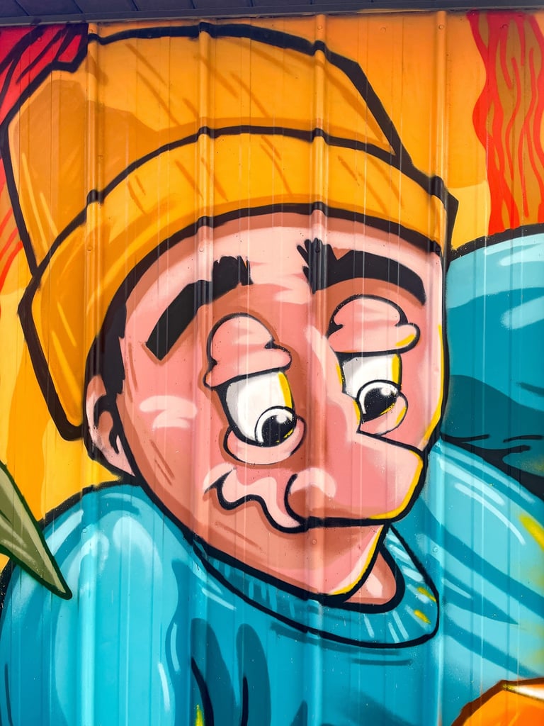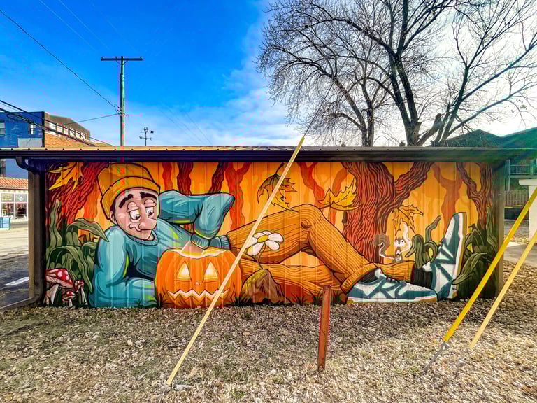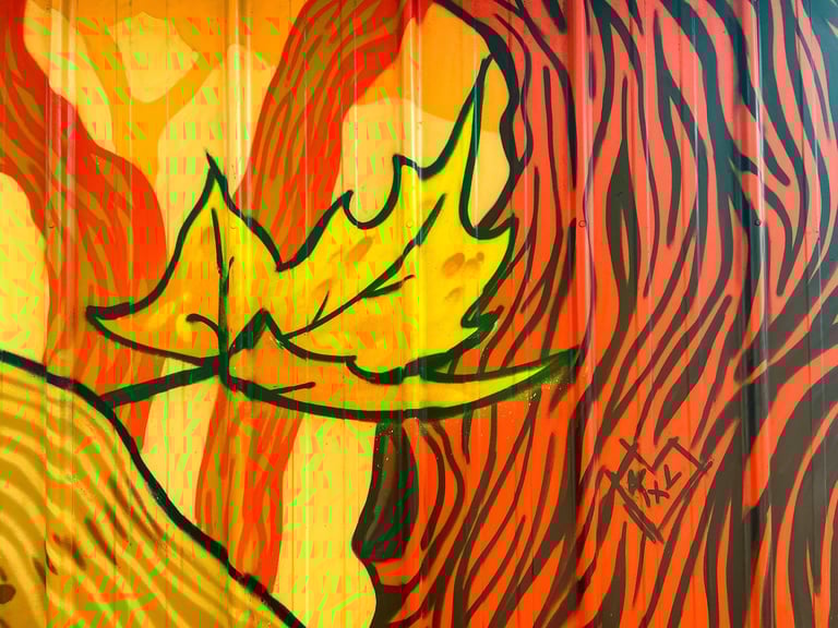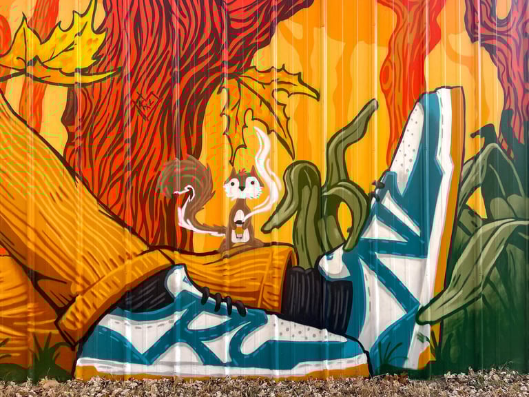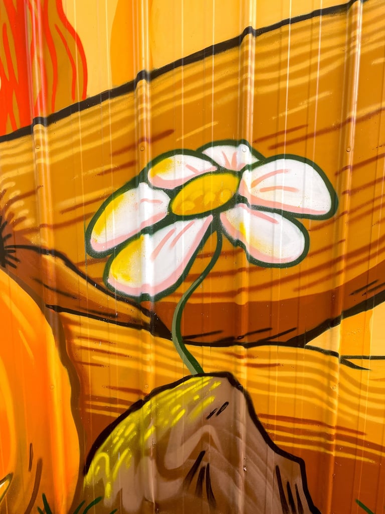 This mural spans across four sides of a building where each wall shares a story in each season. This guy is seen protecting and nurturing the plant through all of the hardships of nature. It describes a symbiotic relationship where the man thinks he is helping this plant stay alive and isn't aware that the plant is keeping him alive through purpose, hope, and joy.