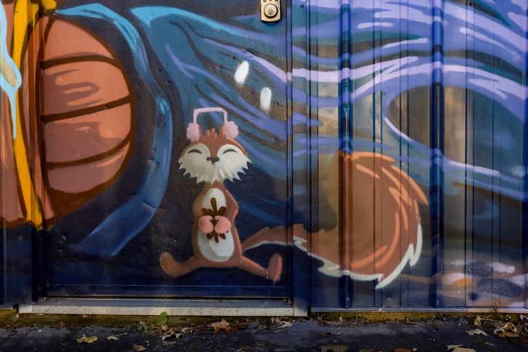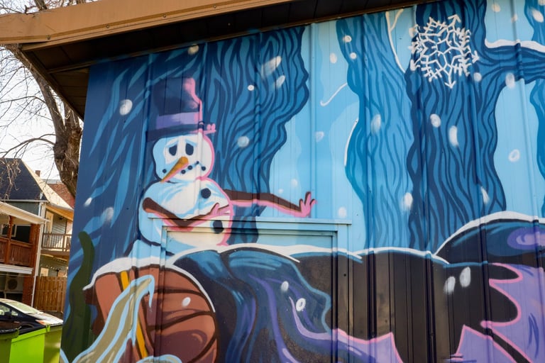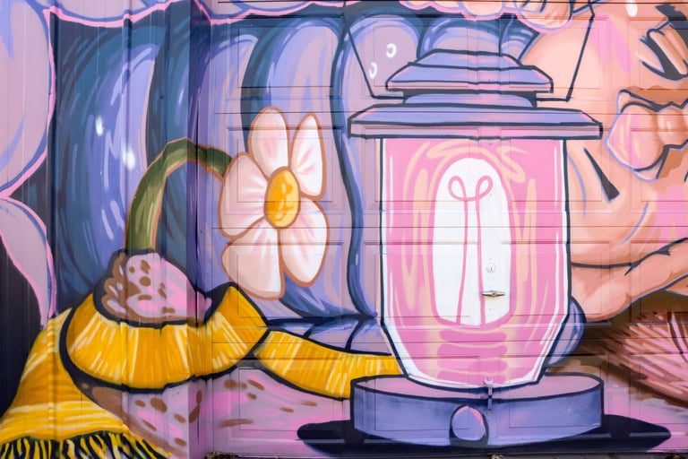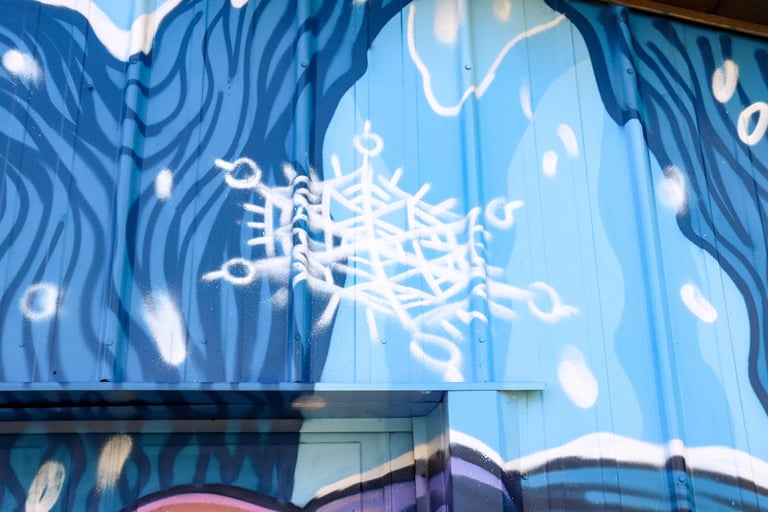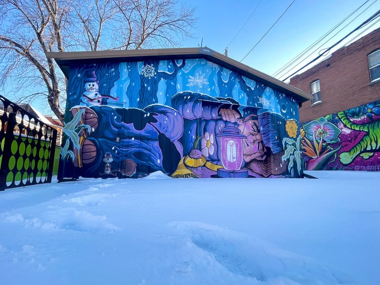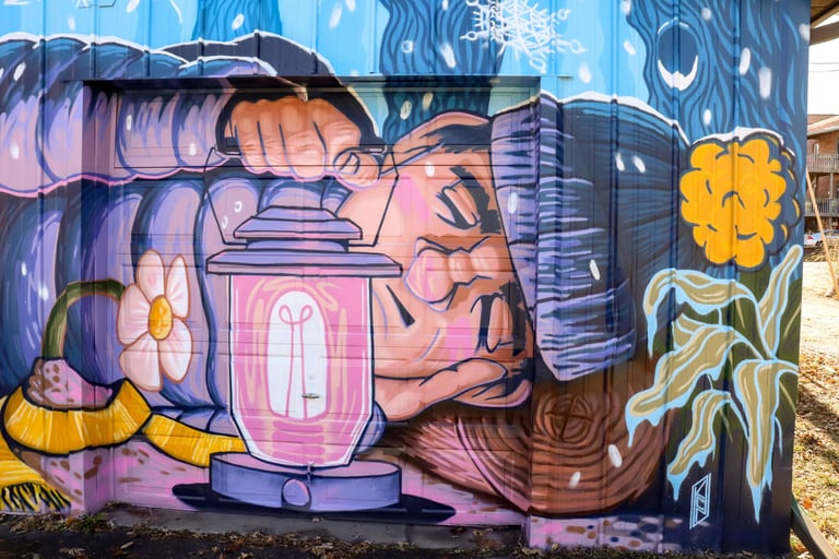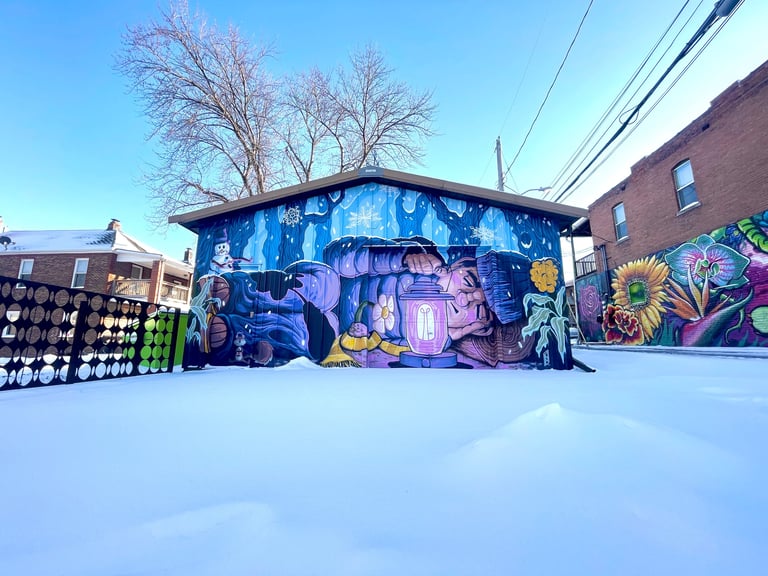 “Nurtured by Nature” explores the evolving relationship between a man and a single resilient plant, told across the four seasons and the four walls of the building. Throughout the mural, the man is depicted protecting, watering, and nurturing the plant through every hardship nature brings. He believes he is the caretaker ensuring its survival, but the plant is also sustaining him through quietly offering purpose, grounding, and moments of hope. Together, they form a symbiotic bond in which both grow.